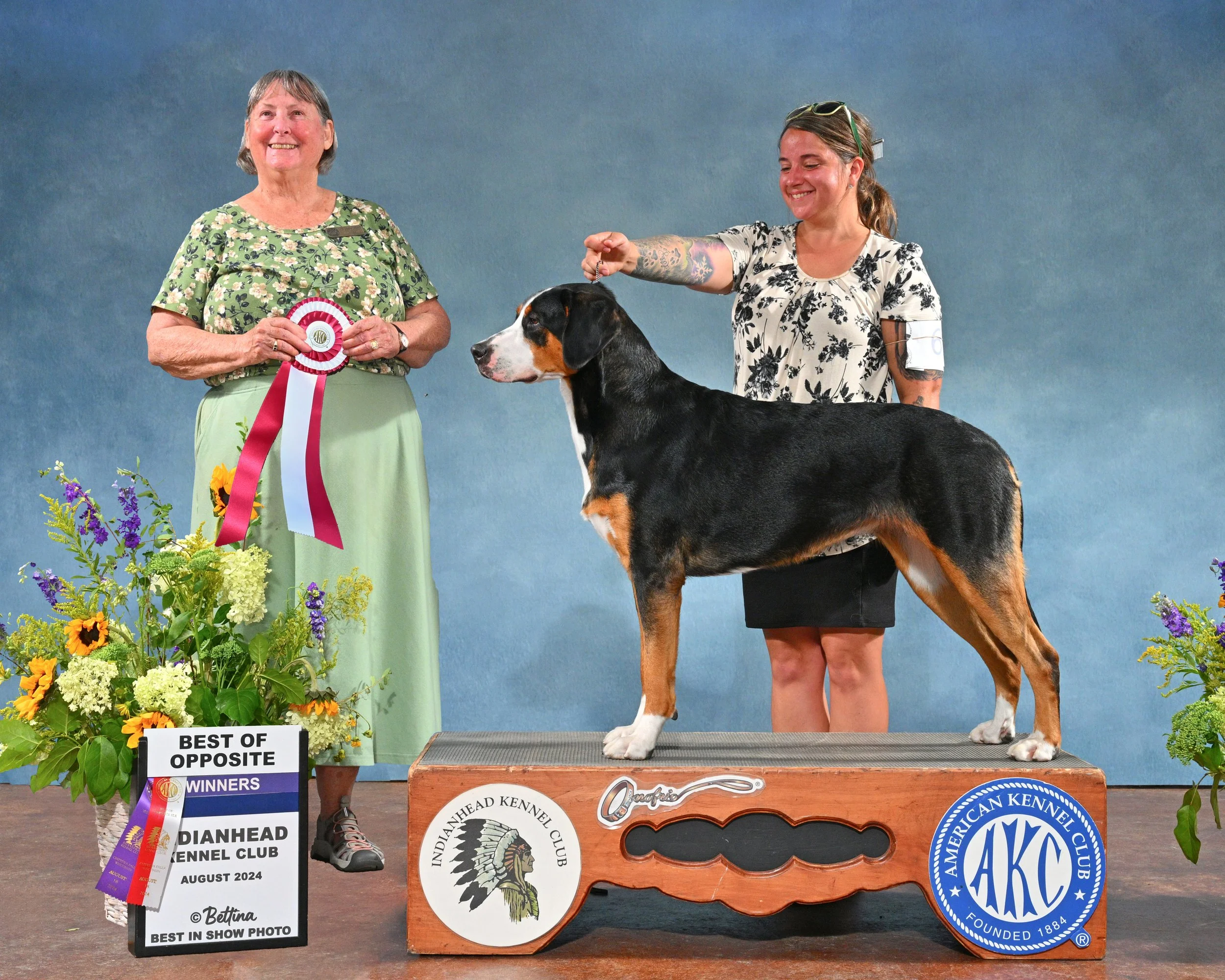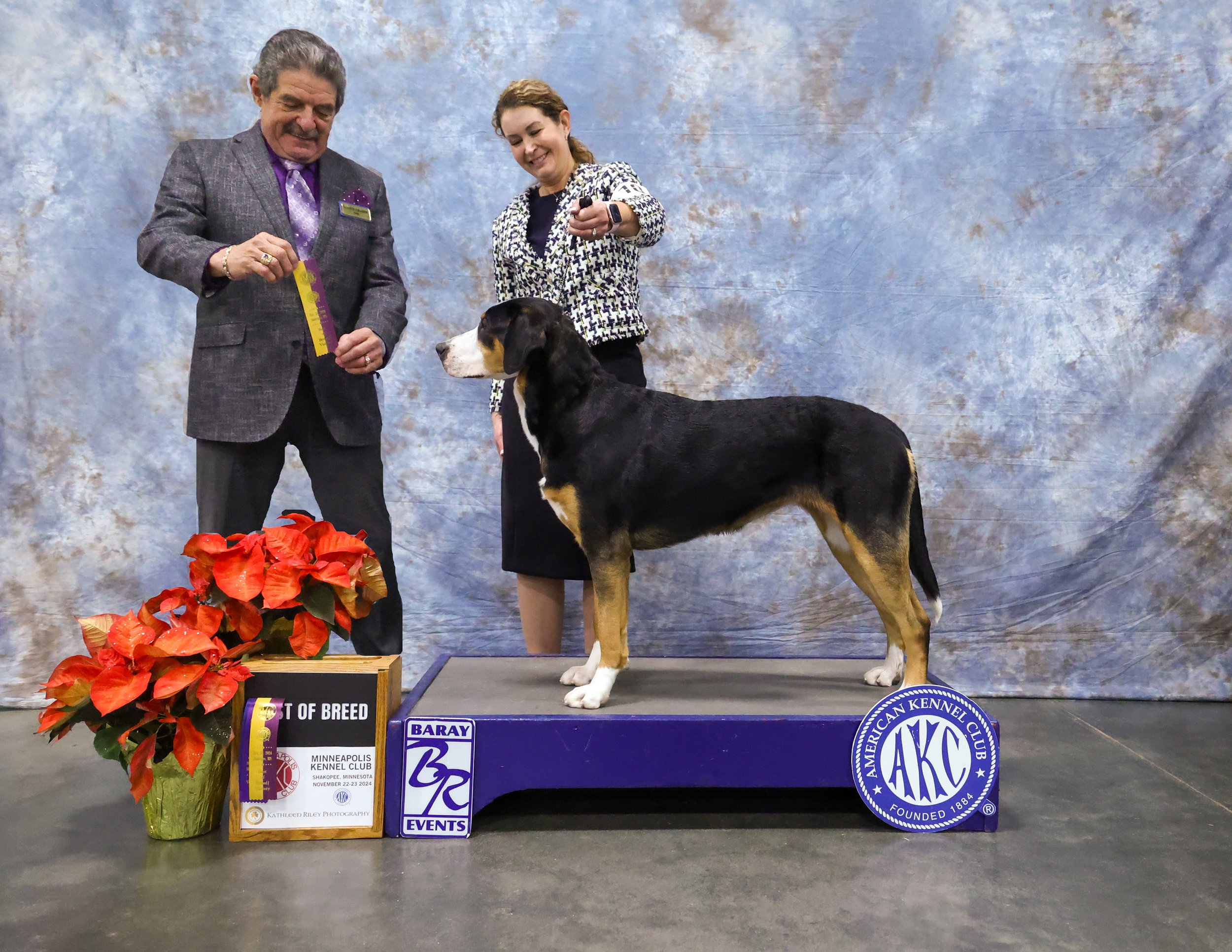 We currently have a beautiful greater Swiss mountain Dog named Lola. She is an AKC champion and also has her novice scent work titles in container and exterior. Lola has an exceptional temperament. She can be very relaxed and enjoys lounging at home but is always excited to go for a walk, play obedience or practice scent work. She adores our two granddaughters and takes her job as being their best friend very seriously.